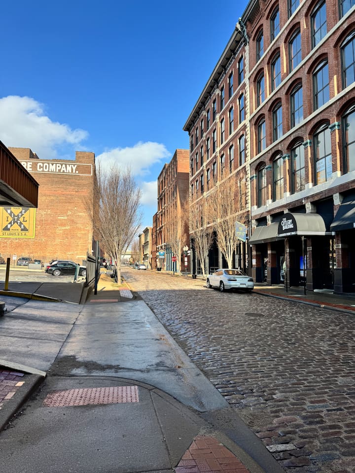 Stylish riverfront loft in the heart of Laclede’s Landing, steps from the Gateway Arch and Mississippi River. Walk to Busch Stadium, Ballpark Village, the Convention Center, and MetroLink. Features a private queen bedroom, open living space, full kitchen, smart TV, fast WiFi, and secure building access. Perfect for game days, conventions, or weekend getaways. Experience downtown St. Louis from the best location in the city.